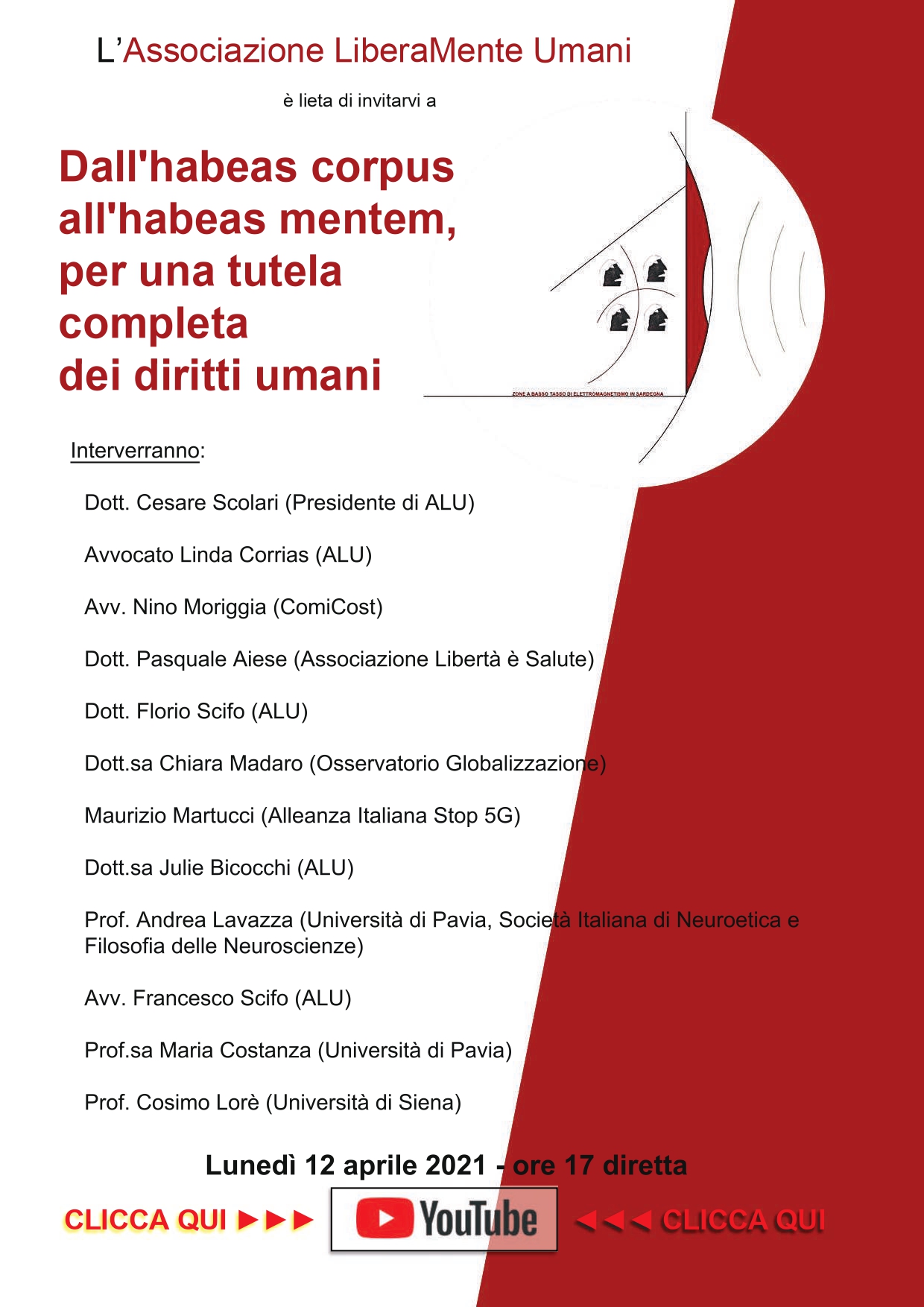 Lunedì 12 Aprile 2021 a partire dalle ore 17 si terrà un evento virtuale dal titolo “Dall’habeas corpus all’habeas mentem, per una tutela completa dei diritti umani”. L’incontro è stato organizzato da ALU (Associazione Liberamente Umani).