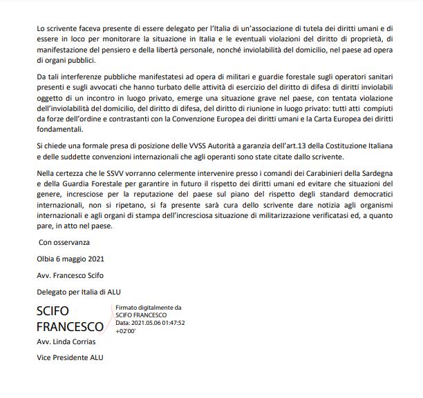 Nella giornata di ieri, 5 Maggio 2021, l’avvocato Francesco Scifo (delegato ALU per l’Italia) e l’avvocato Linda Corrias (vicepresidente di ALU) si trovavano presso la località Cugnana per un incontro richiesto dalle locali maestranze degli operatori sanitari, attinente alla difesa dei diritti umani delle stesse.