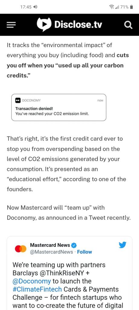 I crediti di carbonio che alcuni ipotizzerebbero da tempo d’introdurre, sviluppano questa l’idea: inducendo ad immaginare un mondo in cui tutto ciò che le persone fanno – mangiare, bere, viaggiare, usare gli elettrodomestici, usare l’elettricità in qualsiasi modo, persino respirare – sia legato alle loro quote personali di carbonio. E immaginiamo che tutti i crediti di carbonio siano controllati e distribuiti da società private sovrastatali cui viene appaltato il sistema.